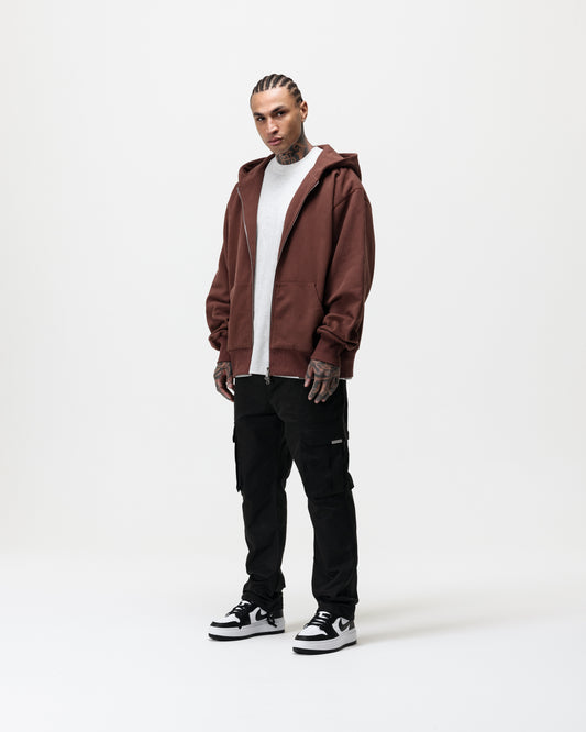 LUXURY ESSENTIALISM ZIP THROUGH HOODIE - VINTAGE WASHED CHOCOLATE